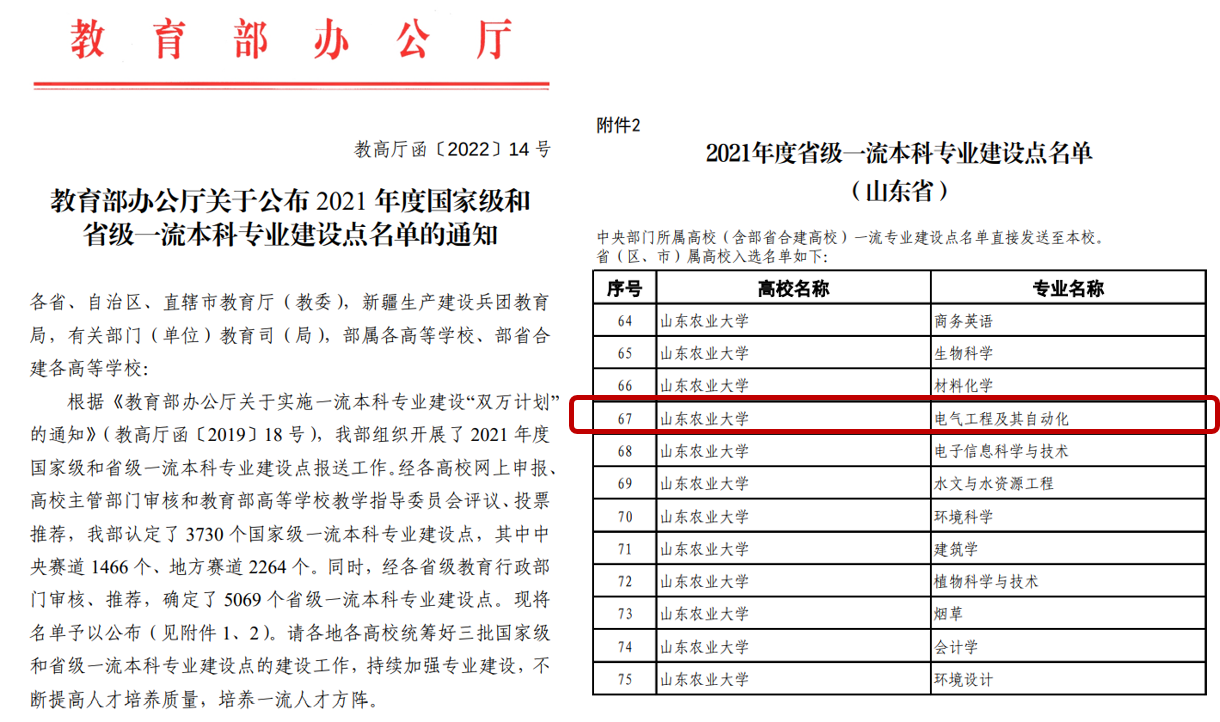 近日,教育部下發(fā)《教育部辦公廳關(guān)于公布2021年度國家級和省級一流本科專業(yè)建設(shè)點名單的通知》(教高廳函〔2022〕14號),山東農(nóng)業(yè)大學新增14個國家級、省級一流本科專業(yè)建設(shè)點。其中,我院電氣工程及其自動化專業(yè)獲批山東省一流本科專業(yè)建設(shè)點。