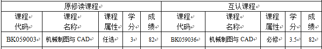 根據(jù)培養(yǎng)方案目前機電學院各專業(yè)本科階段需至少完成總學分為170,大類分為必修和選修兩部分,從大部分專業(yè)培養(yǎng)方案來看主要分為10個課組(模塊);建議同學每個學期登錄教務(wù)系統(tǒng)對照自己的修讀要求,查看自己課程的完成情況,有需要重修、補修的課程盡早安排修讀。下面對必修和選修課需要注意的問題做一下說明。 一、必修課 必修課(課程代碼以BK-、BS-開始的課程大學生心理健康教育例外)課程培養(yǎng)方案明確規(guī)定,必須修讀這些課程而且課程代碼也必須按照方案要求修讀;這些課程是在排課的時候直接給植入系統(tǒng)的,正常情況下不需要同學進行操作就會出現(xiàn)在課表里(每個學期大家可以對照自己修讀要求查看課表是否有落漏的課程)。 部分同學因降低級、轉(zhuǎn)專業(yè)、不及格重修等原因所修讀的課程代碼不是自己培養(yǎng)方案要求的代碼的(這種情況查看自己的修讀詳情可以看到所修讀的課程不在要求的必修模塊中,而是顯示在“其他”模塊),需要進行課程替代(注:只有內(nèi)容相近的課程才能進行課程替代),就是用已經(jīng)修讀獲得學分的這個課程(申請表里叫“原修讀課程”)替代為方案要求的課程(申請表里叫“互認課程”)。進行課程替代有兩種情況, 1、原修讀課程與互認課程學分相同或者原修讀課程學分高于互認課程,登錄教務(wù)系統(tǒng)進行課程替代申請; 2、原修讀課程學分低于互認課程學分0.5分或者少于0.5分的課程需要寫一篇關(guān)于本課程的論文(具體內(nèi)容可以咨詢?nèi)握n教師,所寫論文需找老師評一下成績),并填寫課程學分互認申請表( 舉例說明:如果同學張三修讀了課程代碼為BK059003(機械制圖與CAD)的課程,學分為3.0,成績?yōu)?/span>82;但是培養(yǎng)方案要求其修讀的課程代碼為BK059036(機械制圖與CAD)學分為3.5。填表課程部分內(nèi)容填寫如下圖