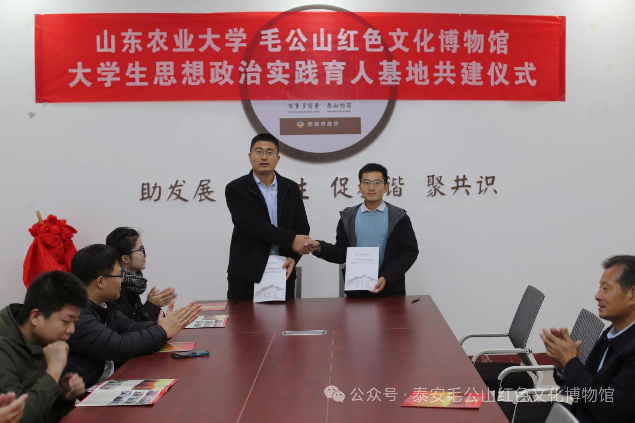 為深入貫徹習(xí)近平總書記“用好紅色資源、賡續(xù)紅色血脈”的重要指示精神,激活紅色資源育人效能,將紅色文化轉(zhuǎn)化為思政教育“活教材”,共建館校協(xié)同育人平臺(tái),推動(dòng)“大思政課”實(shí)踐創(chuàng)新發(fā)展,10月31日,山東農(nóng)業(yè)大學(xué)與泰安毛公山紅色文化博物館聯(lián)合舉辦大學(xué)生思想政治實(shí)踐育人基地共建儀式。