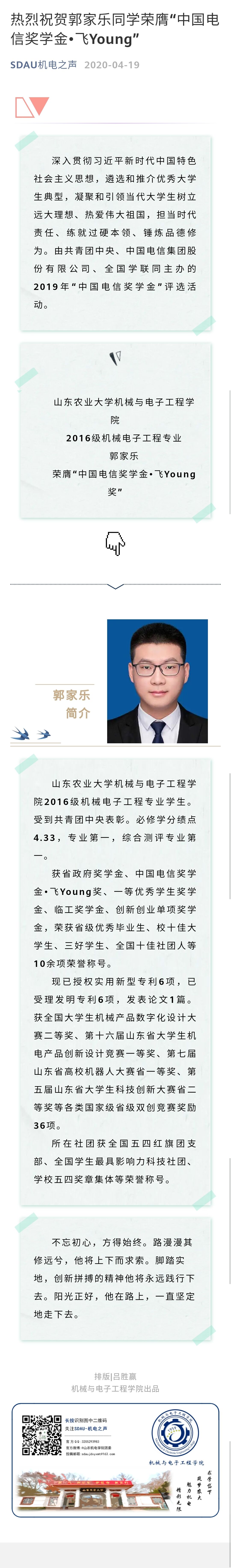 熱烈祝賀郭家樂同學(xué)榮膺“中國電信獎學(xué)金?飛Young”