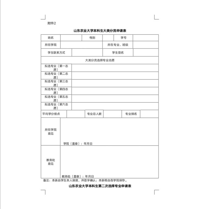 山東農(nóng)業(yè)大學本科生大類分流申請表