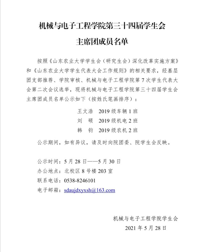 機械與電子工程學院第三十四屆學生會主席團成員名單
